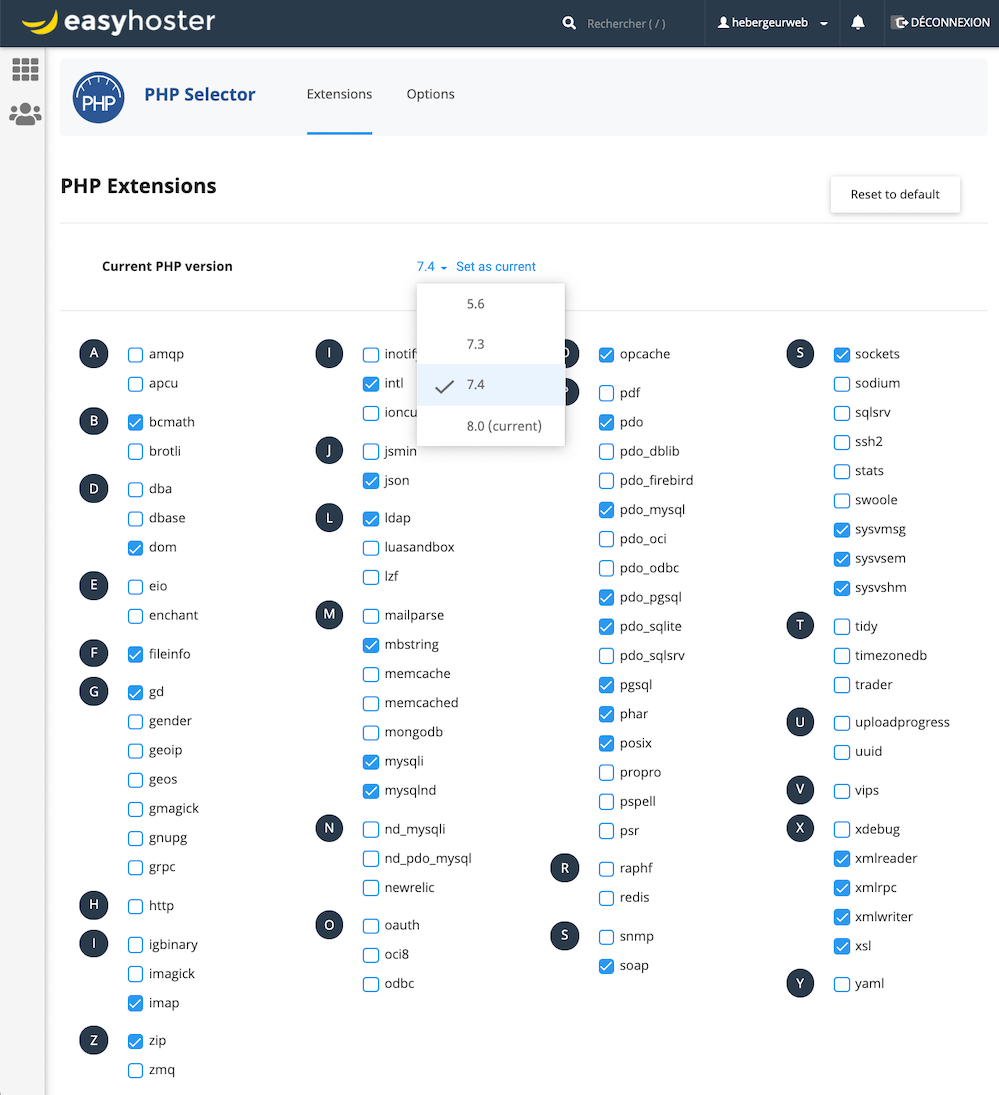 Suivez la procédure complète décrite ci-dessus pour PHP 8.4, mais dans votre compte cPanel, sélectionnez la version PHP 7.4.