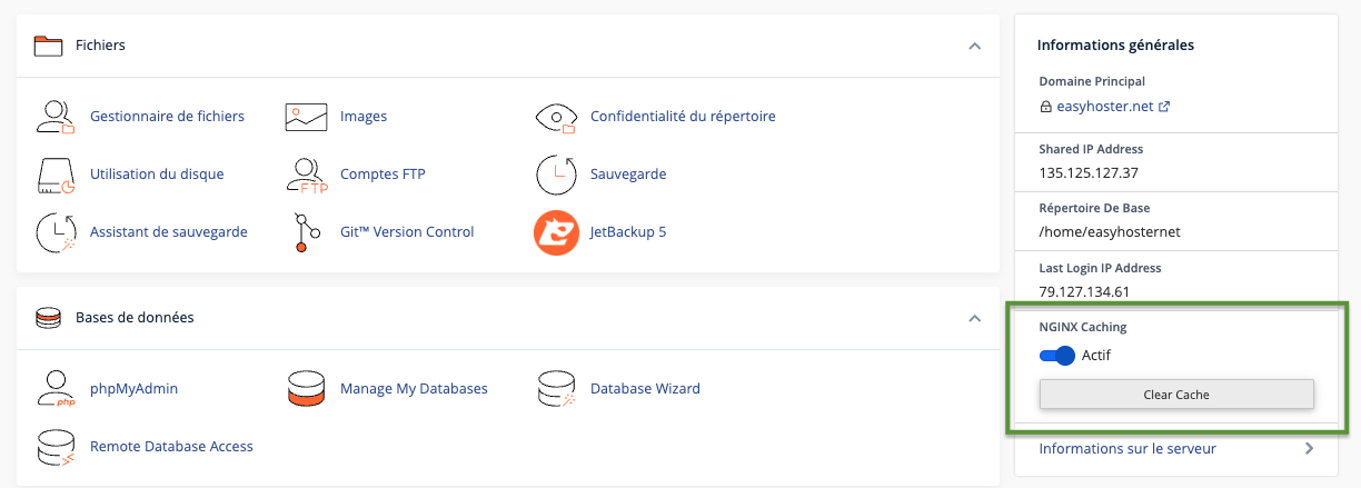 Bien sûr, vous êtes libre de désactiver ce cache NGINX en toute autonomie depuis la page d’accueil de votre compte cPanel où il vous est également possible de “vider ce cache” (comme illustré ci-dessous), au cas où vous seriez confronté à une donnée qui ne se mettrait pas à jour après modification (rare cas peu probable).